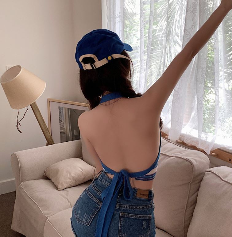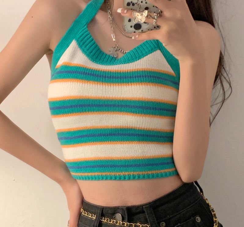 니트 홀터넥 나시 끈조절 민소매 여름 크롭티 바다 스트라이프 리본 슬리브리스 : 필수템샵